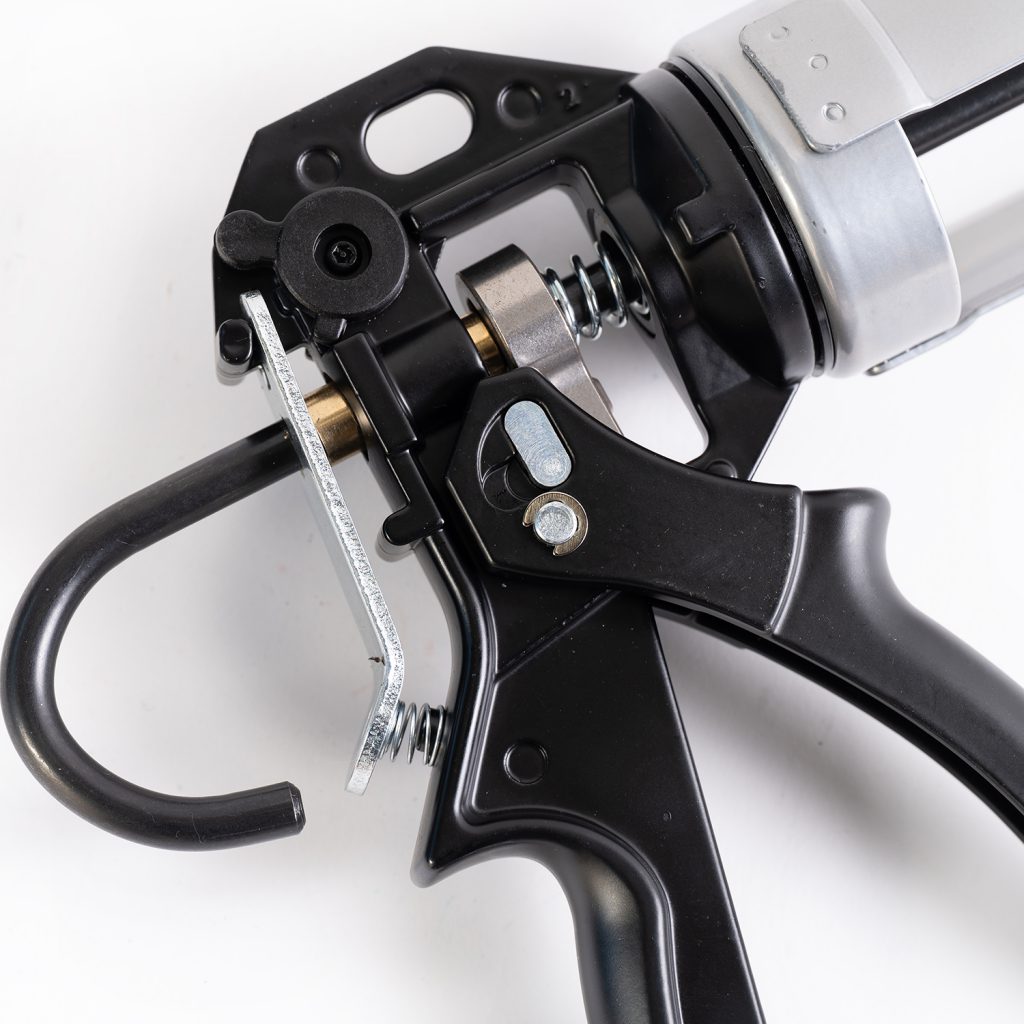 Caulking Gun Hardtouch® Duo sealant gun is specially designed for professional craftsmen. This application tool has two ratio options. 12:1 for normal use and a reinforced 25:1 version for high-density adhesives and sealants. Two tools in one.